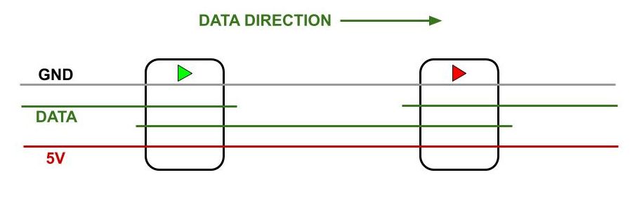 While not as obvious as LED strips, the fairy lights are actually labeled to indicate the 5V, ground and data lines, and the direction of data flow. I covered this above but will include the pinout diagram here for reference.